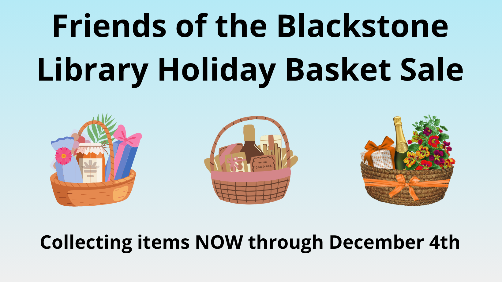 Friends of the Blackstone Library Holiday Basket Sale December 11-14 Help us fill our baskets. Collecting items NOW through December 4th. We accept new or gift quality items. Please bring donations to the bottom floor circulation desk. Basket or basket item ideas: